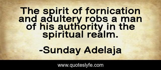 This page presents the quote "The spirit of fornication and adultery robs a man of his authority in the spiritual realm.". Author of this quote is Sunday Adelaja. This quote is about spiritual, realm, robs, authority, fornication, adultery, spirit, man,.