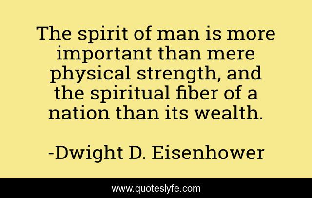 This page presents the quote "The spirit of man is more important than mere physical strength, and the spiritual fiber of a nation than its wealth.". Author of this quote is Dwight D. Eisenhower. This quote is about spiritual, wealth, man,.