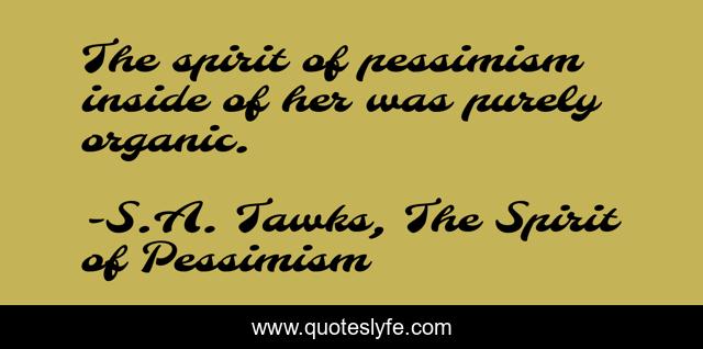 This page presents the quote "The spirit of pessimism inside of her was purely organic.". Author of this quote is S.A. Tawks, The Spirit of Pessimism. This quote is about sad, pessimism, organic, mood, spirit,.
