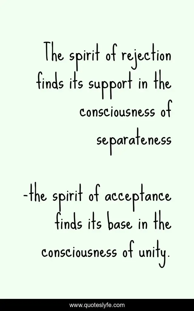 This page presents the quote "The spirit of rejection finds its support in the consciousness of separateness". Author of this quote is the spirit of acceptance finds its base in the consciousness of unity.. .