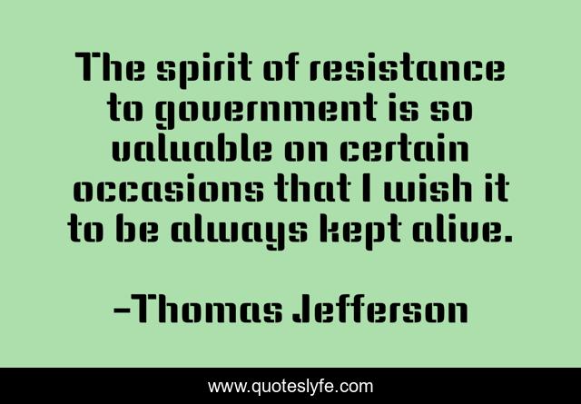 This page presents the quote "The spirit of resistance to government is so valuable on certain occasions that I wish it to be always kept alive.". Author of this quote is Thomas Jefferson. This quote is about wish, resistance, always,.