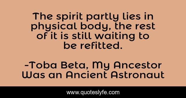This page presents the quote "The spirit partly lies in physical body, the rest of it is still waiting to be refitted.". Author of this quote is Toba Beta, My Ancestor Was an Ancient Astronaut. This quote is about essence, spirit,.