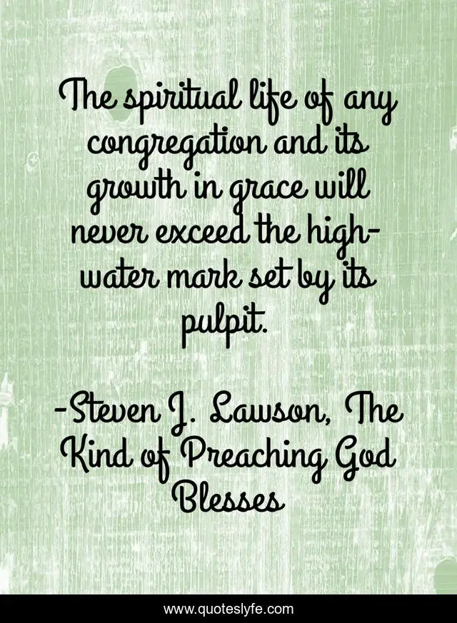 This page presents the quote "The spiritual life of any congregation and its growth in grace will never exceed the high-water mark set by its pulpit.". Author of this quote is Steven J. Lawson, The Kind of Preaching God Blesses. This quote is about spiritual-growth, preaching,.