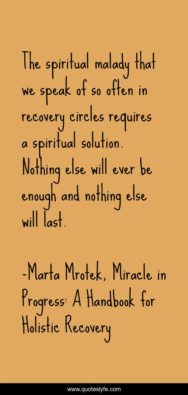This page presents the quote "The spiritual malady that we speak of so often in recovery circles requires a spiritual solution. Nothing else will ever be enough and nothing else will last.". Author of this quote is Marta Mrotek, Miracle in Progress: A Handbook for Holistic Recovery. This quote is about spiritual, healing, recovery,.