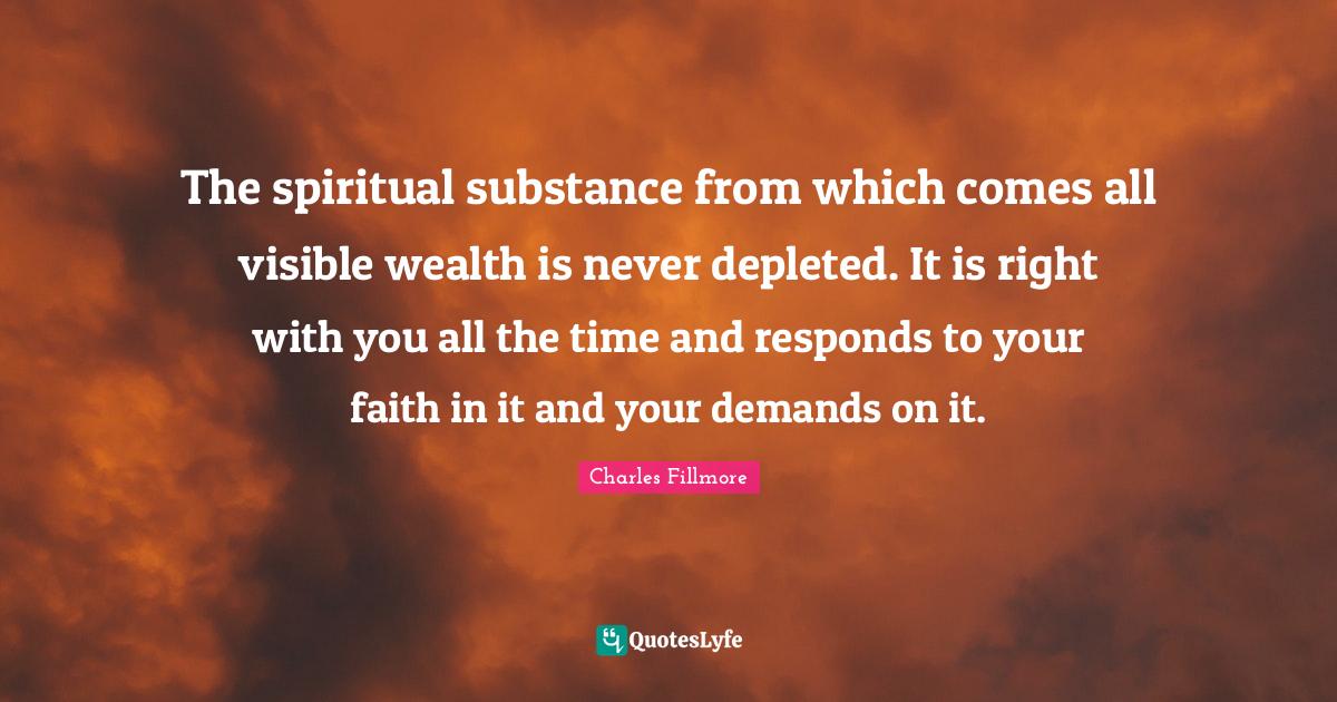 This page presents the quote "The spiritual substance from which comes all visible wealth is never depleted. It is right with you all the time and responds to your faith in it and your demands on it.". Author of this quote is Charles Fillmore. This quote is about time, demand, visible, spiritual, substance, faith, wealth,.
