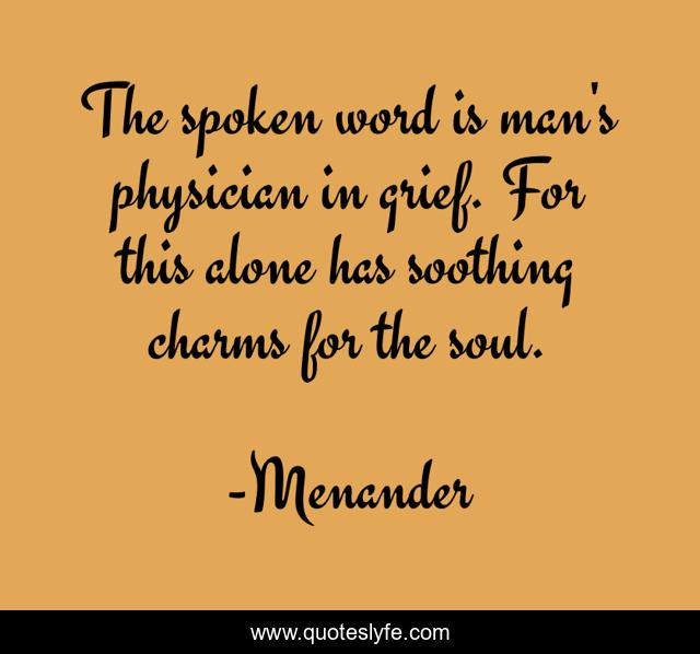 This page presents the quote "The spoken word is man's physician in grief. For this alone has soothing charms for the soul.". Author of this quote is Menander. This quote is about grief, soul, man,.
