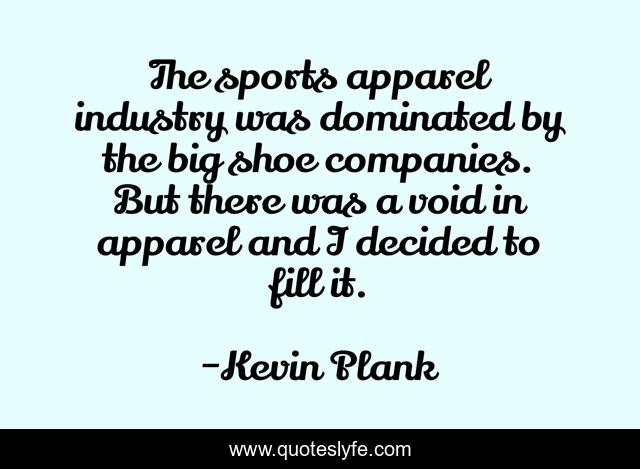 This page presents the quote "The sports apparel industry was dominated by the big shoe companies. But there was a void in apparel and I decided to fill it.". Author of this quote is Kevin Plank. This quote is about big, industry, shoe,.
