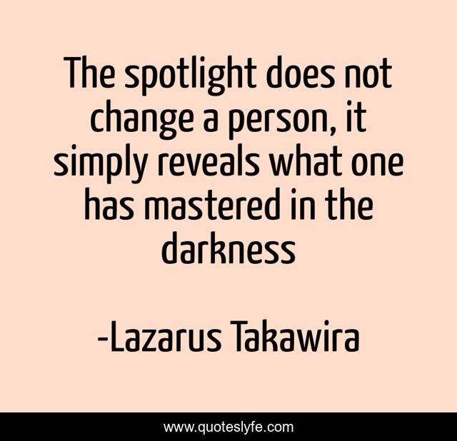 This page presents the quote "The spotlight does not change a person, it simply reveals what one has mastered in the darkness". Author of this quote is Lazarus Takawira. This quote is about leadership, leadership-development,.