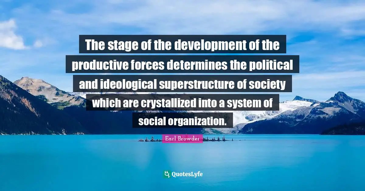 This page presents the quote "The stage of the development of the productive forces determines the political and ideological superstructure of society which are crystallized into a system of social organization.". Author of this quote is Earl Browder. This quote is about social, stage, productive, development, society, political, organization, ideological,.