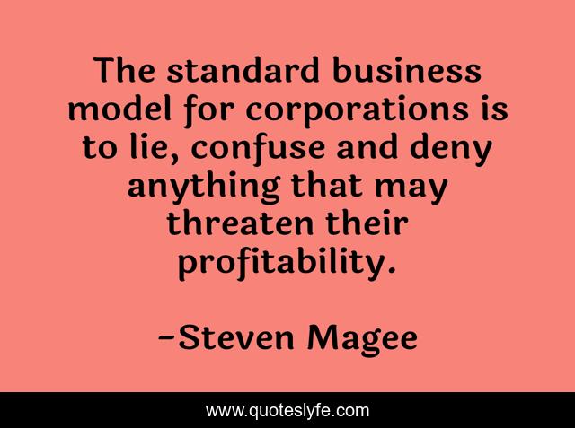 This page presents the quote "The standard business model for corporations is to lie, confuse and deny anything that may threaten their profitability.". Author of this quote is Steven Magee. This quote is about lie, deny, anything, business, deny-everything, may, confuse, profitability, standard,.