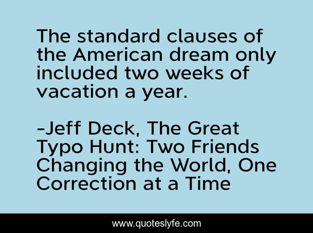This page presents the quote "The standard clauses of the American dream only included two weeks of vacation a year.". Author of this quote is Jeff Deck, The Great Typo Hunt: Two Friends Changing the World, One Correction at a Time. This quote is about sarcasm, humor,.
