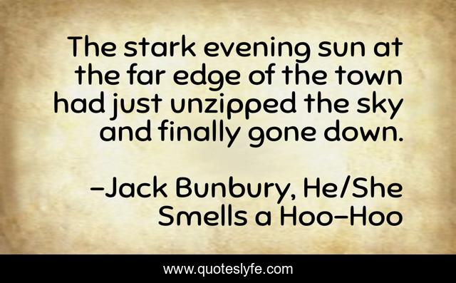 This page presents the quote "The stark evening sun at the far edge of the town had just unzipped the sky and finally gone down.". Author of this quote is Jack Bunbury, He/She Smells a Hoo-Hoo. This quote is about humorous, sunset, great-description,.