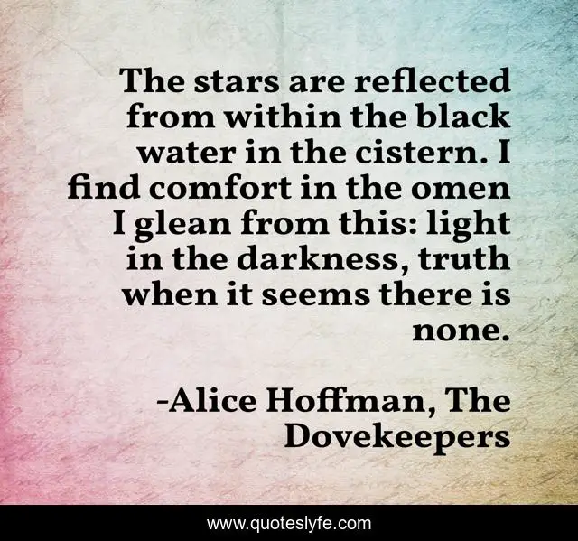 This page presents the quote "The stars are reflected from within the black water in the cistern. I find comfort in the omen I glean from this: light in the darkness, truth when it seems there is none.". Author of this quote is Alice Hoffman, The Dovekeepers. This quote is about light, truth,.