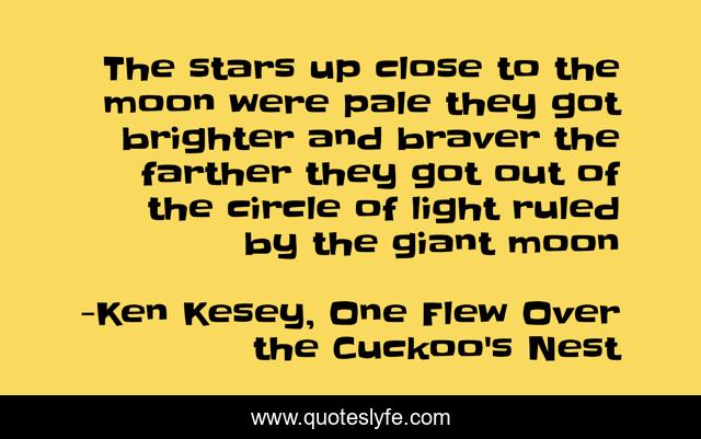 This page presents the quote "The stars up close to the moon were pale they got brighter and braver the farther they got out of the circle of light ruled by the giant moon". Author of this quote is Ken Kesey, One Flew Over the Cuckoo's Nest. This quote is about visual, observation, inspiration,.