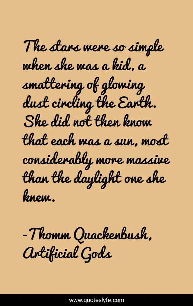 This page presents the quote "The stars were so simple when she was a kid, a smattering of glowing dust circling the Earth. She did not then know that each was a sun, most considerably more massive than the daylight one she knew.". Author of this quote is Thomm Quackenbush, Artificial Gods. This quote is about sun, stars,.