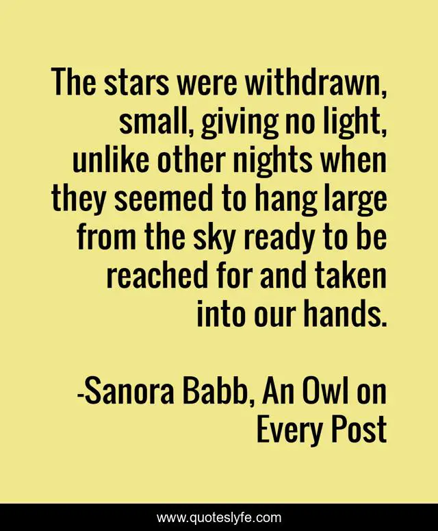 "Sanora Babb, An Owl on Every Post Quotes." Quoteslyfe.com, 2025. Fri. 05 Dec. 2025. <https://www.quoteslyfe.com/quote/The-stars-were-withdrawn-small-giving-no-204497>.