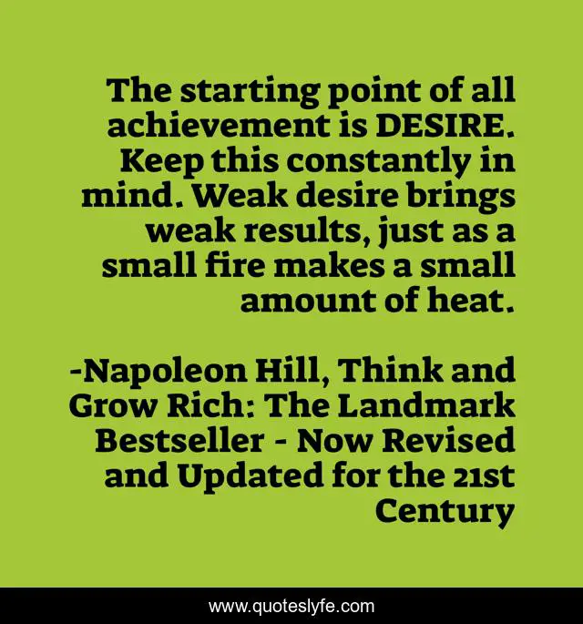 This page presents the quote "The starting point of all achievement is DESIRE. Keep this constantly in mind. Weak desire brings weak results, just as a small fire makes a small amount of heat.". Author of this quote is Napoleon Hill, Think and Grow Rich: The Landmark Bestseller - Now Revised and Updated for the 21st Century. This quote is about enthusiasm, inspirational,.