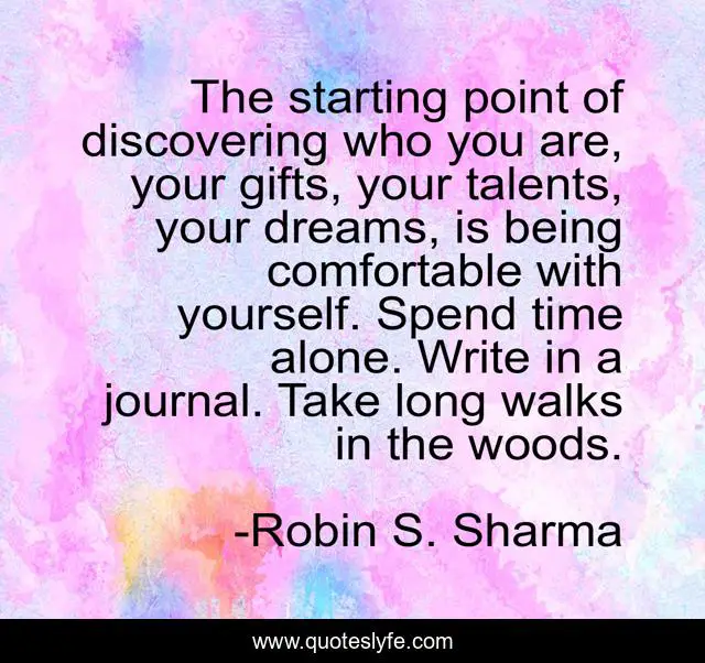This page presents the quote "The starting point of discovering who you are, your gifts, your talents, your dreams, is being comfortable with yourself. Spend time alone. Write in a journal. Take long walks in the woods.". Author of this quote is Robin S. Sharma. This quote is about alone, time, yourself,.