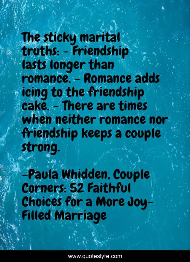 "Paula Whidden, Couple Corners: 52 Faithful Choices for a More Joy-Filled Marriage Quotes." Quoteslyfe.com, 2025. Mon. 08 Dec. 2025. <https://www.quoteslyfe.com/quote/The-sticky-marital-truths-Friendship-lasts-longer-209131>.
