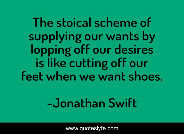This page presents the quote "The stoical scheme of supplying our wants by lopping off our desires is like cutting off our feet when we want shoes.". Author of this quote is Jonathan Swift. .