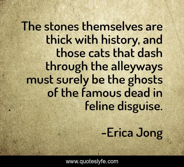This page presents the quote "The stones themselves are thick with history, and those cats that dash through the alleyways must surely be the ghosts of the famous dead in feline disguise.". Author of this quote is Erica Jong. This quote is about ghosts, cats, history,.