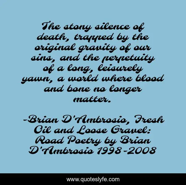"Brian D'Ambrosio, Fresh Oil and Loose Gravel: Road Poetry by Brian D'Ambrosio 1998-2008 Quotes." Quoteslyfe.com, 2025. Fri. 05 Dec. 2025. <https://www.quoteslyfe.com/quote/The-stony-silence-of-death-trapped-by-220186>.
