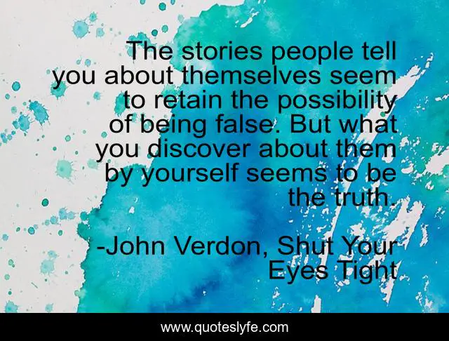 This page presents the quote "The stories people tell you about themselves seem to retain the possibility of being false. But what you discover about them by yourself seems to be the truth.". Author of this quote is John Verdon, Shut Your Eyes Tight. This quote is about false, stories, truth,.