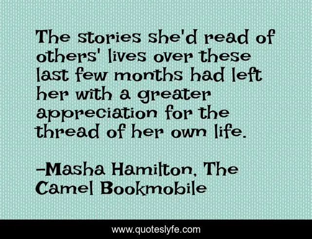 This page presents the quote "The stories she'd read of others' lives over these last few months had left her with a greater appreciation for the thread of her own life.". Author of this quote is Masha Hamilton, The Camel Bookmobile. .