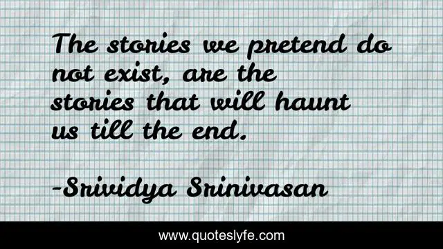 This page presents the quote "The stories we pretend do not exist, are the stories that will haunt us till the end.". Author of this quote is Srividya Srinivasan. This quote is about end, pretend, stories, stories-life,.