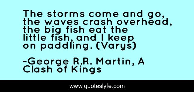 This page presents the quote "The storms come and go, the waves crash overhead, the big fish eat the little fish, and I keep on paddling. (Varys)". Author of this quote is George R.R. Martin, A Clash of Kings. This quote is about mad-skills, a-clash-of-kings, manipulation, war, omniscient,.