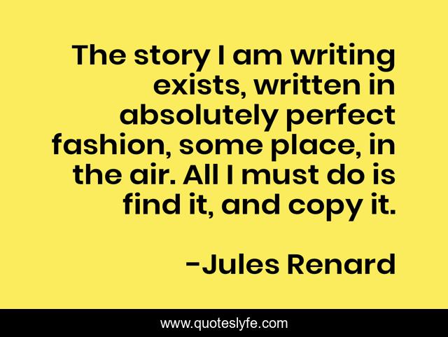 This page presents the quote "The story I am writing exists, written in absolutely perfect fashion, some place, in the air. All I must do is find it, and copy it.". Author of this quote is Jules Renard. This quote is about enthusiasm, inspirational, writing,.