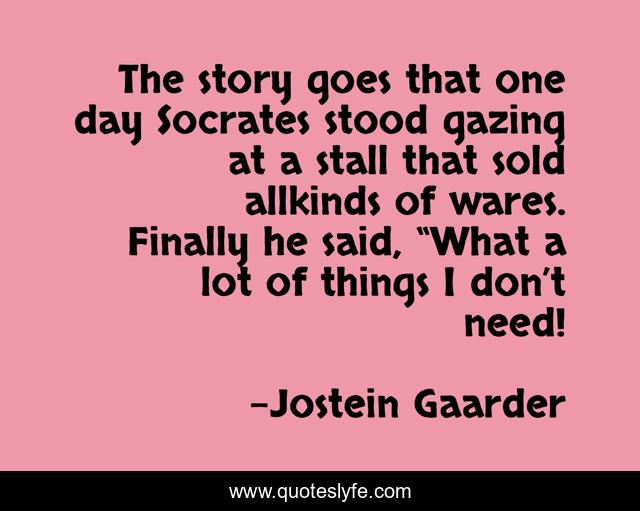 This page presents the quote "The story goes that one day Socrates stood gazing at a stall that sold allkinds of wares. Finally he said, “What a lot of things I don’t need!". Author of this quote is Jostein Gaarder. This quote is about need, things, philosophy, reflection,.