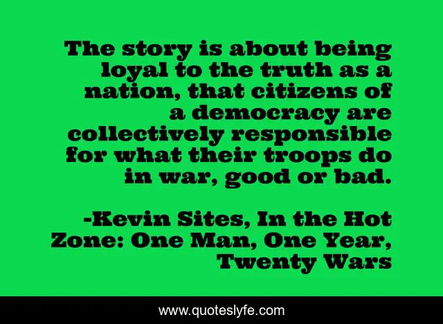 This page presents the quote "The story is about being loyal to the truth as a nation, that citizens of a democracy are collectively responsible for what their troops do in war, good or bad.". Author of this quote is Kevin Sites, In the Hot Zone: One Man, One Year, Twenty Wars. This quote is about responsibility, war, truth, democracry,.