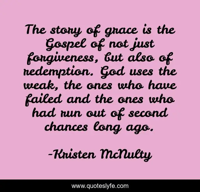 This page presents the quote "The story of grace is the Gospel of not just forgiveness, but also of redemption. God uses the weak, the ones who have failed and the ones who had run out of second chances long ago.". Author of this quote is Kristen McNulty. This quote is about faith, redemption, inspirational, enthusiasm, forgiveness, grace,.