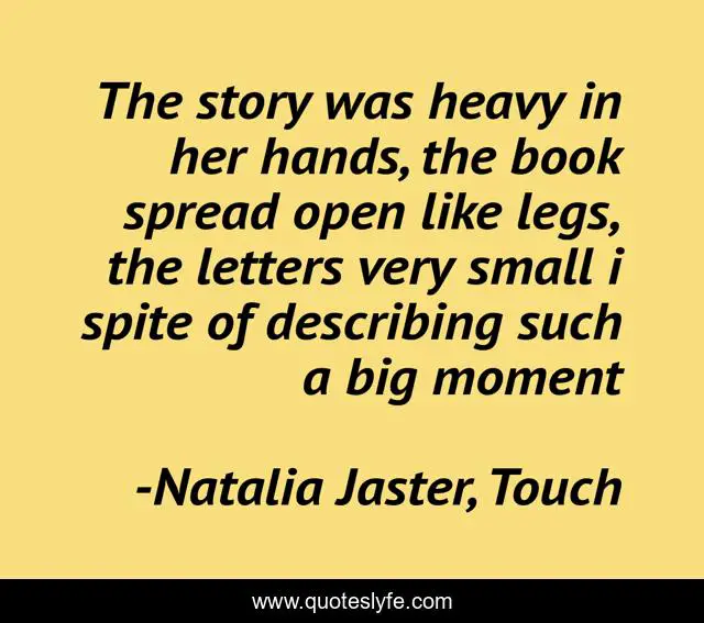 This page presents the quote "The story was heavy in her hands, the book spread open like legs, the letters very small i spite of describing such a big moment". Author of this quote is Natalia Jaster, Touch. This quote is about love, fiction, books, stories, touch, natalia-jaster, affection,.