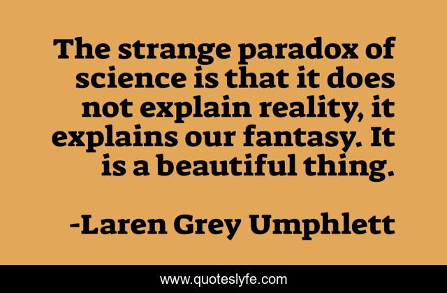 This page presents the quote "The strange paradox of science is that it does not explain reality, it explains our fantasy. It is a beautiful thing.". Author of this quote is Laren Grey Umphlett. This quote is about philosophy, science-fiction-romance, reality,.