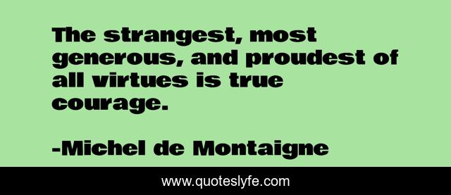 This page presents the quote "The strangest, most generous, and proudest of all virtues is true courage.". Author of this quote is Michel de Montaigne. This quote is about most, true, virtues,.