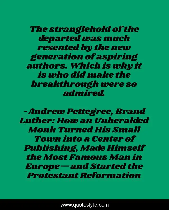 This page presents the quote "The stranglehold of the departed was much resented by the new generation of aspiring authors. Which is why it is who did make the breakthrough were so admired.". Author of this quote is Andrew Pettegree, Brand Luther: How an Unheralded Monk Turned His Small Town into a Center of Publishing, Made Himself the Most Famous Man in Europe—and Started the Protestant Reformation. This quote is about relevance, communication, persuasion, traditions, change,.