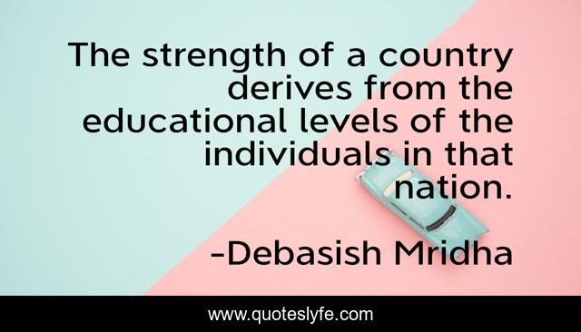 This page presents the quote "The strength of a country derives from the educational levels of the individuals in that nation.". Author of this quote is Debasish Mridha. This quote is about make-a-nation-strong, educational-levels, philosophy, debasish-mridha, debasish-mridha-m-d, quotes, how-to-improve-a-nation, inspirational, enthusiasm,.