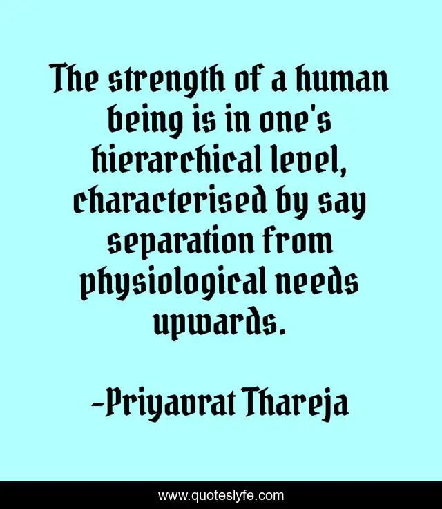 This page presents the quote "The strength of a human being is in one's hierarchical level, characterised by say separation from physiological needs upwards.". Author of this quote is Priyavrat Thareja. This quote is about hierarchy, elevation, human,.