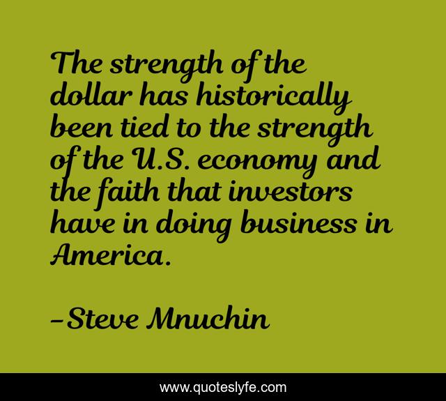 This page presents the quote "The strength of the dollar has historically been tied to the strength of the U.S. economy and the faith that investors have in doing business in America.". Author of this quote is Steve Mnuchin. This quote is about faith, america, business,.
