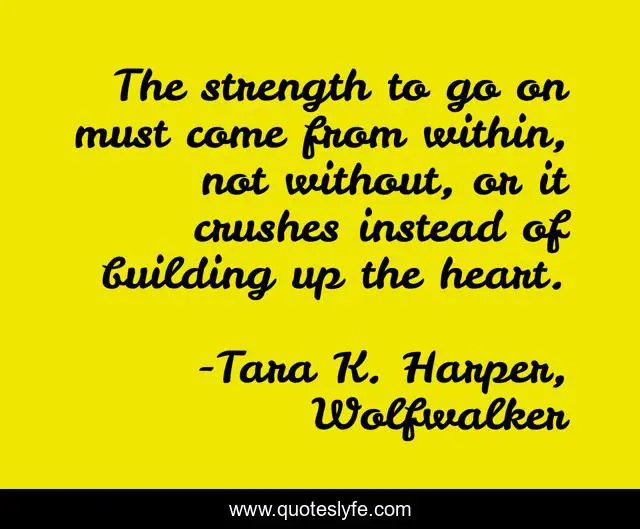 This page presents the quote "The strength to go on must come from within, not without, or it crushes instead of building up the heart.". Author of this quote is Tara K. Harper, Wolfwalker. This quote is about coping, strength, struggle,.