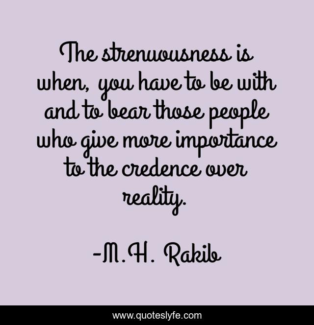 This page presents the quote "The strenuousness is when, you have to be with and to bear those people who give more importance to the credence over reality.". Author of this quote is M.H. Rakib. This quote is about importance, society, pleople, credence, reality,.