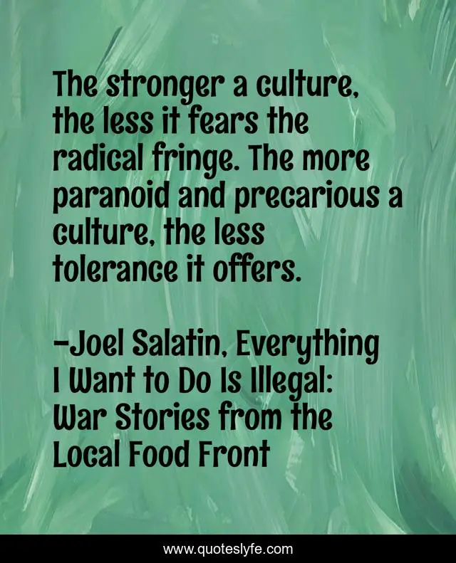 This page presents the quote "The stronger a culture, the less it fears the radical fringe. The more paranoid and precarious a culture, the less tolerance it offers.". Author of this quote is Joel Salatin, Everything I Want to Do Is Illegal: War Stories from the Local Food Front. This quote is about culture, philosophy,.