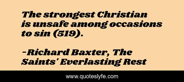 This page presents the quote "The strongest Christian is unsafe among occasions to sin (519).". Author of this quote is Richard Baxter, The Saints' Everlasting Rest. This quote is about christianity, sin, temptation,.