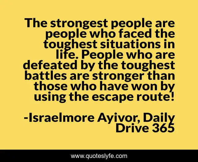 This page presents the quote "The strongest people are people who faced the toughest situations in life. People who are defeated by the toughest battles are stronger than those who have won by using the escape route!". Author of this quote is Israelmore Ayivor, Daily Drive 365. This quote is about strong-men, food-for-thought, tough, people, escape, life, battles, strong-people, defeat,.