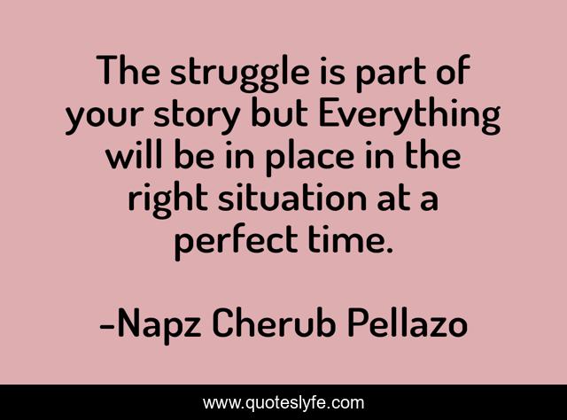 This page presents the quote "The struggle is part of your story but Everything will be in place in the right situation at a perfect time.". Author of this quote is Napz Cherub Pellazo. This quote is about story, is-part-of-your, perfect-time, napz-cherub-pellazo, everything-will-be-in-place, of-your-self, but, part, perfection,.