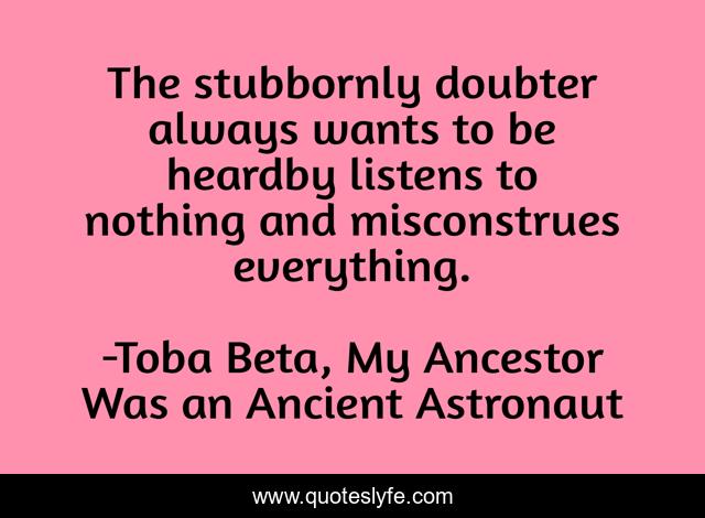 This page presents the quote "The stubbornly doubter always wants to be heardby listens to nothing and misconstrues everything.". Author of this quote is Toba Beta, My Ancestor Was an Ancient Astronaut. This quote is about stubborn, doubt, misconstrue, listen,.