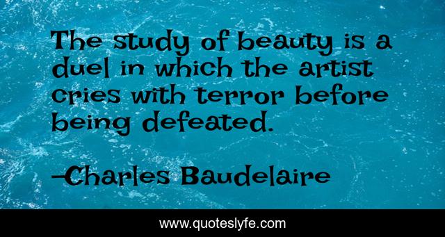 This page presents the quote "The study of beauty is a duel in which the artist cries with terror before being defeated.". Author of this quote is Charles Baudelaire. This quote is about study, defeated, artist,.