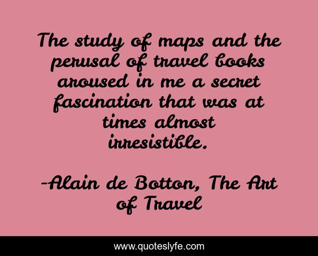 This page presents the quote "The study of maps and the perusal of travel books aroused in me a secret fascination that was at times almost irresistible.". Author of this quote is Alain de Botton, The Art of Travel. This quote is about travel, explorer, alexander-von-humboldt, scientists,.